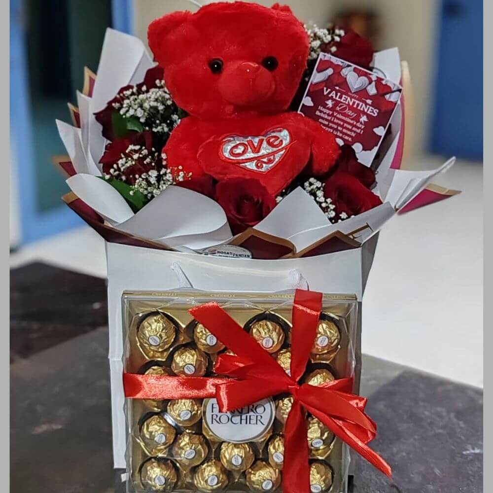 10 Mixed Roses Bouquet White teddy and Ferrero