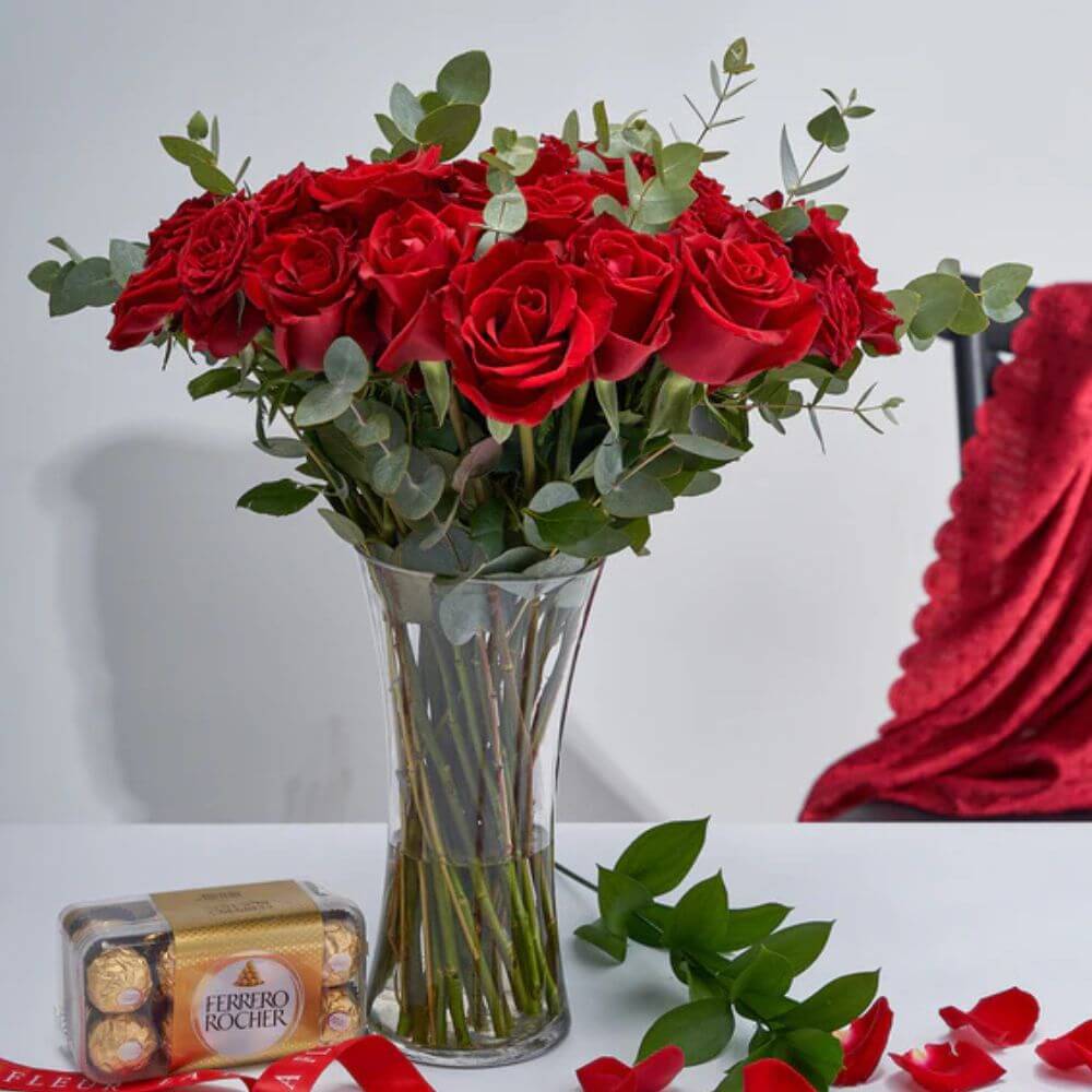 20 Red Roses in a Vase With Ferrero Rocher 200g