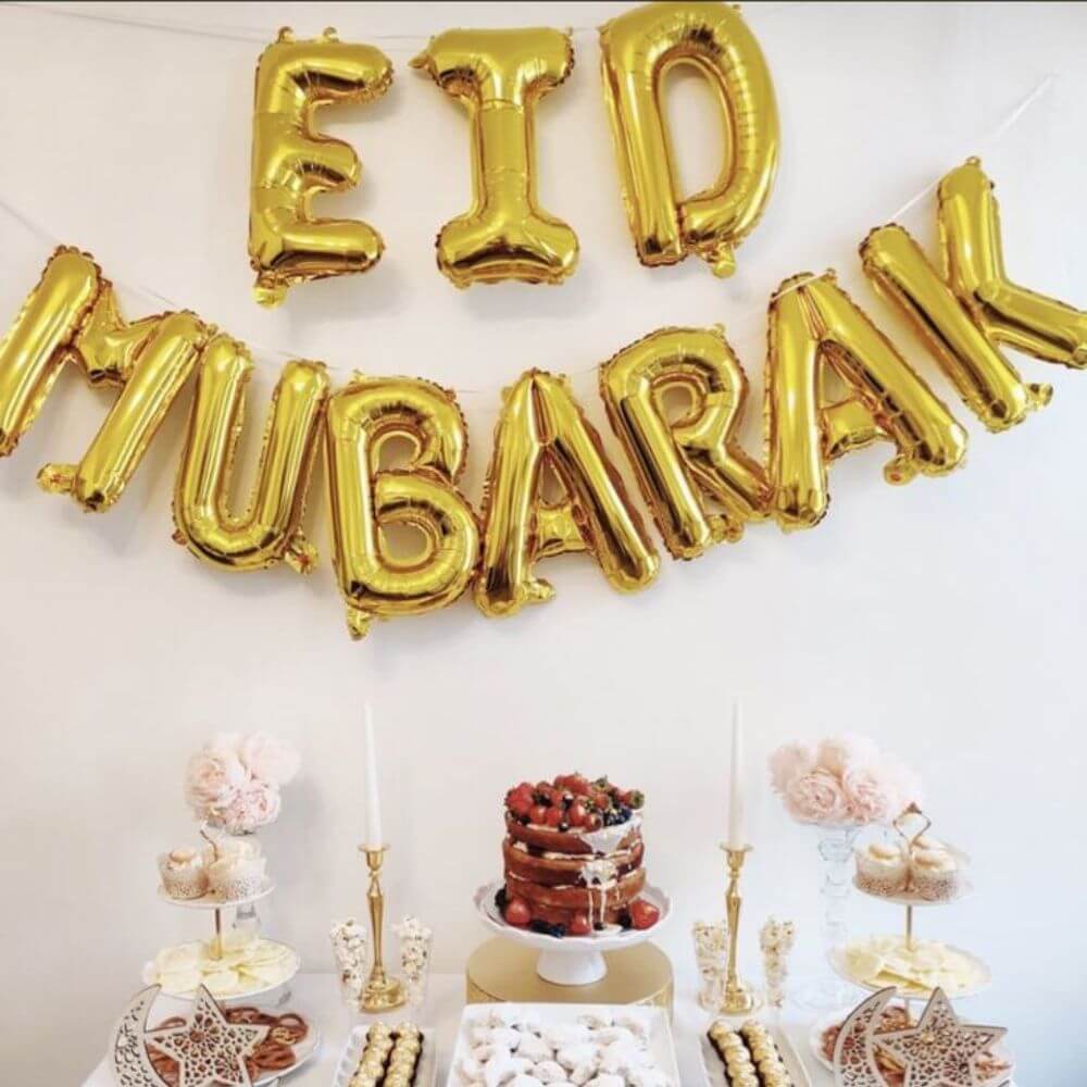 - Banner Design:Â A vibrant banner featuring large, gold-colored foil balloons elegantly shaped into the letters spelling “Eid Mubarak,” adding a touch of luxury to your decor.