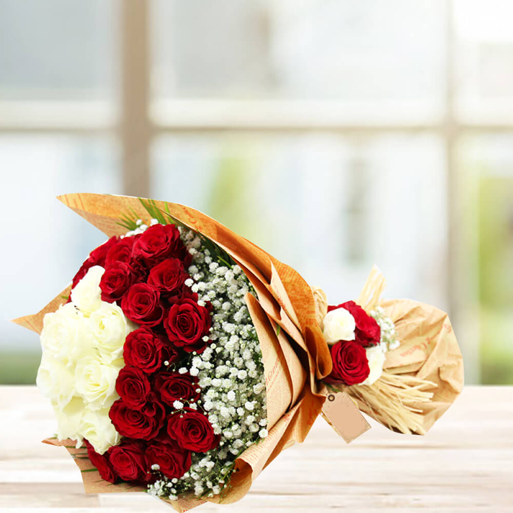 Elegant 24 red & white roses bouquet perfect expression of Love and Association
