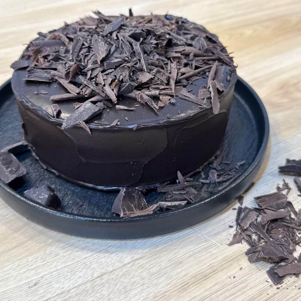 Indulge in the rich, glossy finish of our luxurious dark chocolate cake. This smooth, dark brown cake is topped generously with chopped dark chocolate pieces, enhancing its irresistible texture. Set on a black, slightly textured dinner plate, the cake is surrounded by scattered chocolate bits, adding to its gourmet appeal. The plate rests on a light-brown wooden surface, showcasing the natural grain of the wood and complementing the cake’s rich color. Perfect for any special occasion or dessert craving.