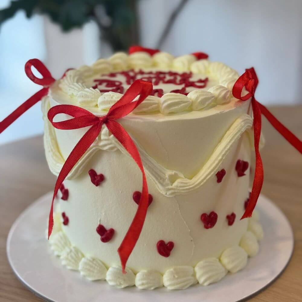 - Frosting: Decorated with small, red heart-shaped decorations sprinkled throughout for a charming touch.