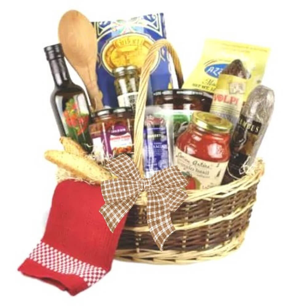 Note: A cheerful red dish towel and a large wooden spoon complete the package! Please note that due to local availability, gift basket items may differ from those pictured.